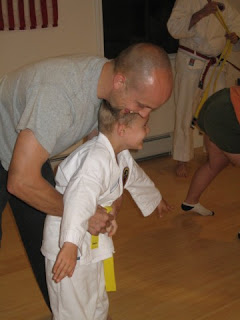 Wesley tested for and received his yellow belt. Michael presented his belt to him in this small traditional ceremony. His instructors have the parents present the belt since we are the ones who are sending him on his karate journey.