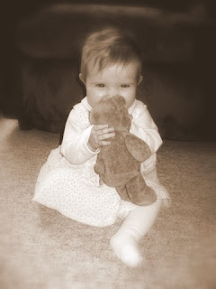 Her eating is about the same! She has 3 meals a day along with nursing. She loves Cheeri0s but still wont put them in her own mouth! Not sure what is up with that! She has tried macaroni, puffs (doesn’t like them), toast, biter biscuits (dislikes), and pizza crust (loves)! She prefers the bland over the sweet. She also mastered her sippy cup this month! Before she would just chew on the spout! Now she is sucking! HOORAY!! Wesley wouldn’t drink from a sippy until he was over 1! This is such a relief!She goes to sleep great at night but still gets up once to eat! I have been trying to wean her from this but it has been really hard for me! Although it is tiring I know that she really needs this because she EATS! I thought maybe she was just looking for comfort but she latches right on and doesn’t even fall back to sleep until I put her back in the crib! It may come back to bite me in the butt because I am sure that it is turning into a habit! I just have an incredibly hard time letting her cry in the crib, knowing that she is hungry:( I can hear the tsk-tsking now! Hush:)