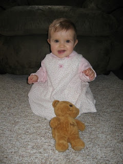 Lani still is not rolling over or crawling. She just kind of twists and scoots around on her bum to get around. She also loves to be walked around while holding onto the hands. When Lani sits on us she will search for our hands, grab them, and pull her self up! There have been times when I had to hide my hands so I could rest my back:) She has been pulling up on the couch, and the stool my laptop is on. She only gets to her knees though.