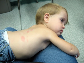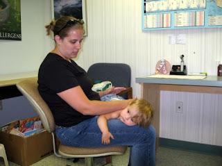 The nurse came in and poked Lani with 16 different allergens. There were environmental and food allergies. Lani screamed and was not too happy about being held down across my lap. Michael was able to catch a picture when she was not crying!!