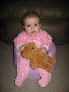 Our little Bainers (this is Daddy’s nick name for her) turned 6 months old on Christmas Eve. Lani is doing so much now! It is hard to keep up with all of her little firsts. She says dadada all of the time now. Every once in a while we will get an ahgoo out of her. She has also discovered her hands and feet. She was beginning to notice them last month but now she is interacting with them. Sometimes she will be playing with a toy, notice her hand, drop the toy, and stare at it while opening and closing it. That always makes me smile:) She loves soft toys that rattle so she can decide whether she would like to chew or shake, two of her favorite things.