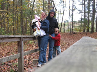 This is a trail that we love to walk during the Fall season. Michael and I discovered this trail while we were still dating and have been going back each year. We went a little later in the season this year so the color was passed but it was still a nice walk. It goes along a beautiful river (not sure which one) with thick trees on the other side that are always bright early in the Fall. We attempted to take some family photos using the timer on the camera. Lani is beginning to like being in her carrier. She even fell asleep when it was Michael’s turn to carry her.
