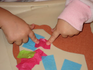 Lani has a new obsession! "bagobba gabobbas"! Or better known as Turkeys. One day we were at Lisa's and there were 17 turkeys in the yard. We taught Lani how to say gobble gobble and she kept going to the window to see them. Even after they were gone! So, today we made a little turkey project:)I made the turkey out of construction paper and stuck it onto clear contact paper. I gave Lani some tissue paper to stick on to the contact paper. We call this a "Hawaiian Turkey" because all I had were the bright colors. When she was all finished I put on another piece of contact paper and trimmed it all up!! It is a great way to build her fine motor skills. Soon after hanging this up, I had to take it down and Lani's been carrying it ever since:)