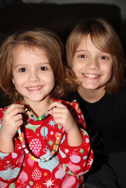 Christmas morning went by quickly:) As usual the kids ripped through their presents. Wesley made this nice necklace for Lani. He was so bummed that it didn't fit so he's going to add some more beads.